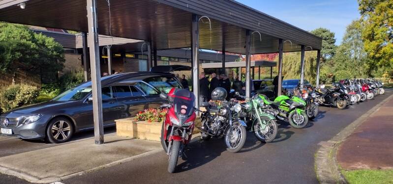Branch Members and colleagues from the Boundless Motorcycle Group attending the funeral of club member Graham Holt at Easthampsted Crematorium on 30 October 2023. A good turnout organised by our Chairman Scott, who rode Graham's new BSA Gold Star to the funeral and to the celebration of Graham's life afterwards at the Easthampstead Park Hotel.